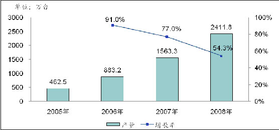 隨著傳統(tǒng)CRT彩電的逐漸被取代,液晶電視的普及已經(jīng)成為不可逆轉的趨勢,并且普及的速度在不斷加快。中國作為全球最大的彩電制造基地和彩電消費市場,在彩電工業(yè)的轉型過程中,液晶電視的產(chǎn)量也出現(xiàn)了爆發(fā)式的增長。根據(jù)賽迪顧問統(tǒng)計,2005年-2008年,中國液晶電視產(chǎn)量的年均復合增長率高達73.4%,2008年產(chǎn)量達到2411.8萬臺。