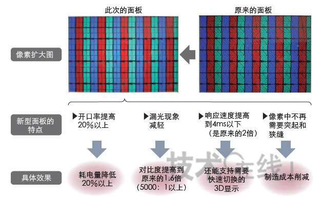 與原來相比,此次的液晶面板具有四大特點。即:耗電量低、對比度高、響應(yīng)速度快、制造成本低。