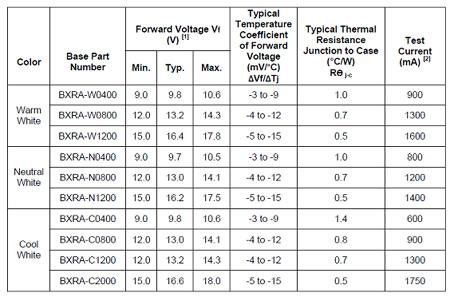 假定對(duì)LED以Io恒流供電,在結(jié)溫為T1時(shí),電壓為V1,而當(dāng)結(jié)溫升高為T2時(shí),整個(gè)伏安特性左移,電流Io不變,電壓變?yōu)閂2。這兩個(gè)電壓差被溫度去除,就可以得到其溫度系數(shù),以mV/oC表示。對(duì)于普通硅二極管,這個(gè)溫度系數(shù)大約為-2mV/oC。但是LED大多數(shù)不是用硅材料制成的,所以它的溫度系數(shù)也要另外去測(cè)定。幸好各家LED廠家的數(shù)據(jù)表中大多給出了它的溫度系數(shù)。例如對(duì)于Cree公司的XLamp7090XR-E大功率LED,其溫度系數(shù)為-4mV/oC。要比普通硅二極管大2倍。至于美國(guó)普瑞的陣列LED(BXRA)就給出了更為詳細(xì)的數(shù)據(jù)。