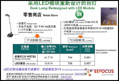 在現(xiàn)場(chǎng),Laurent Jenck 展示了兩款從零售商店購(gòu)得的鹵素臺(tái)燈(采用35 W燈泡)。一款采用原鹵素?zé)?,另外一款則采用了安森美NCP1014芯片進(jìn)行穩(wěn)壓改進(jìn)。原鹵素?zé)粼?20 Vac條件下的輸入功率為41.7 W,在0.5米距離處測(cè)得的光亮度為744流明。采用了自供電單片式開(kāi)關(guān)穩(wěn)壓器的臺(tái)燈在120 Vac條件下輸入功率為10.9 W,即能耗僅相當(dāng)于鹵素?zé)舻?/4;同時(shí),這LED臺(tái)燈在同等距離條件下測(cè)得的光亮度為795流明,更優(yōu)于鹵素?zé)簦?2.9流明/瓦(lm/W)的能效(efficacy)更是數(shù)倍于鹵素?zé)?17.8 lm/W)。
