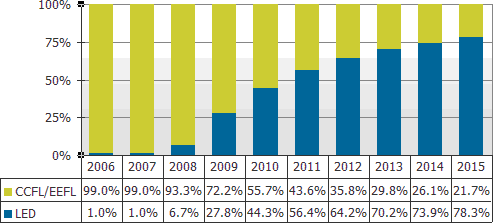 圖一 2006-2015採用傳統(tǒng)CCFL&EEFL燈管與LED背光大尺寸液晶面板出貨比率預(yù)測