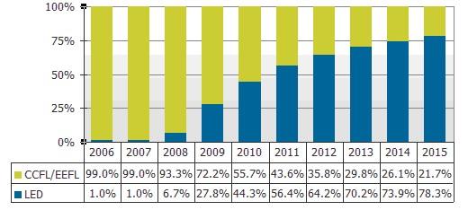 2006-2015采用傳統(tǒng)CCFL&EEFL燈管與LED背光大尺寸液晶面板出貨比率預測