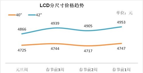 元旦到春節(jié)前的旺季內(nèi)不僅城市市場有很強的爆發(fā)力,而且村鎮(zhèn)市場的需求量將會得到極大的釋放。所以,從元旦到春節(jié)前連續(xù)6周的市場旺季整體市場的均價將會有一定的波動。以40英寸和42英寸液晶電視為例來看,價格將呈現(xiàn)小幅周度波動的變化。(詳見下圖)