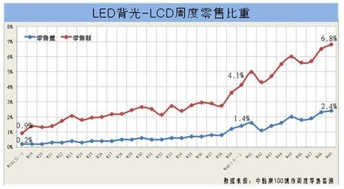 - LED背光電視零售額占整體液晶電視的比重已經(jīng)從五一期間的0.9%增長到目前的6.8%