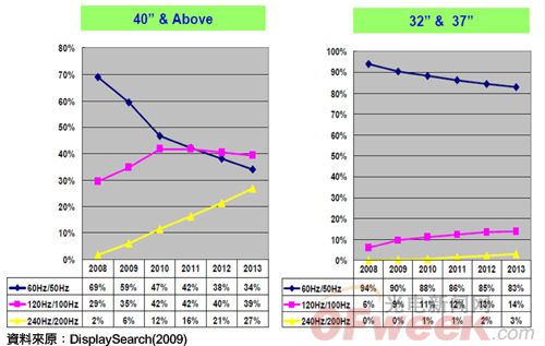 DisplaySearch預(yù)估,減少動態(tài)模糊(Motion Blur)、達(dá)成品牌區(qū)隔、消費(fèi)者喜好及提高毛利率將為帶動120Hz、240Hz液晶面板需求的主要動力,觀察32寸、37寸及40寸以上液晶面板,50Hz/60Hz比重明顯下降;反之,120Hz/240Hz比例有上升趨勢,尤其在40寸以上最為明顯(如圖1)。