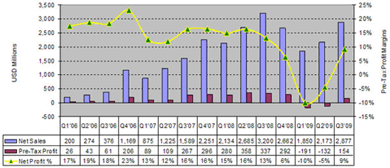 在2009年上半年,生產(chǎn)能力過剩和整個供應鏈的供過于求,造成太陽能發(fā)電系統(tǒng)的平均價格降幅達25%以上。然而低價格的刺激,較為容易的融資環(huán)境,以及需求的多樣化,加上各個國家及區(qū)域新的獎勵政策推出,讓主要的廠商在2009年第三季順利轉虧為盈。