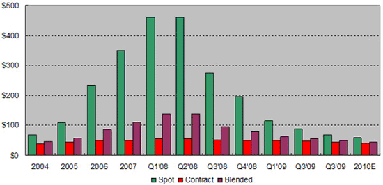 太陽能電池制造商把重點放在降低成本以維持一定獲利率的同時,也將持續(xù)推動電價往Grid Parity (太陽發(fā)電成本與傳統(tǒng)發(fā)電成本相當)的方向進行。主要降低成本的方法包括使用較少的硅,或使用較便宜的硅。多晶硅(Polysilicon)是主要用于制造結晶硅(c-Si)太陽能電池的晶圓材料。而其占到整體太陽能模塊成本的15%到20%。由于大量多晶硅新產(chǎn)能的開出以及過去這一年的需求減少,硅晶的價格自2008年下半年起因供過于求而大幅下跌,目前雖然跌勢已經(jīng)趨緩,但預計2010年仍為供過于求的狀況,因此價格將持續(xù)下降。圖2為多晶硅價格趨勢。