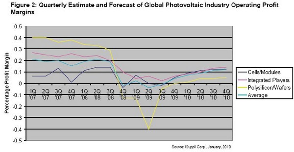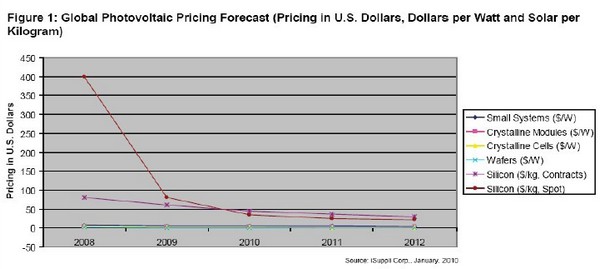 2009 年,光伏系統(tǒng)的平均價(jià)格下跌11%左右,而晶體硅組件的平均價(jià)格重挫了38%。iSuppli 公司預(yù)測,2010 年光伏系統(tǒng)的價(jià)格將下降10%,組件價(jià)格將再下跌20%。