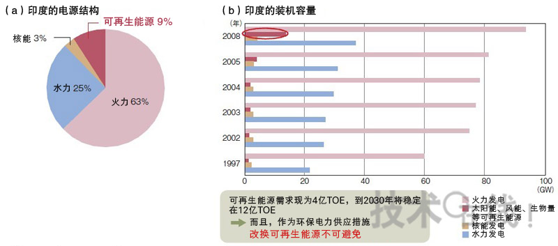 為了解決上面不穩(wěn)定的電力供應和環(huán)境問題,可再生能源成為了關注的焦點。民間調(diào)查機構(gòu)的推測顯示,到2030年,印度對于可再生能源的需求將增加到現(xiàn)在4億TOE(石油換算噸)的3倍,達到12億TOE。