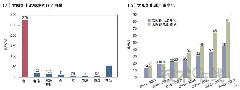 圖3:太陽能電池絕大多數(shù)出口在印度生產(chǎn)的太陽能電池模塊的用途中,出口占絕大多數(shù)。模塊和單元產(chǎn)量在2003年以后快速增加(b)。