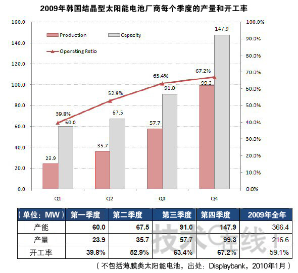 Displaybank稱,韓國(guó)廠商設(shè)備開工率的上升,主要得益于以德國(guó)為中心的歐洲市場(chǎng)上太陽(yáng)能電池需求的改善。不僅是設(shè)備開工率,生產(chǎn)能力也得到了大幅上升。具體而言,產(chǎn)能由2009年第一季度的60MW,迅速攀升至2009年第四季度的147.9MW。Displaybank預(yù)測(cè),如果今后繼續(xù)保持這一趨勢(shì),2010年第一季度的開工率將提高至70%。