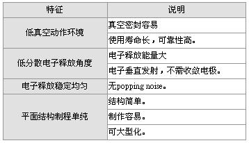 BSD是應(yīng)用彈道電子釋放特性構(gòu)成冷陰極電子源,它的電子釋放原理不同于傳統(tǒng)FED。表2是BSD代表性特徵,由表2可知BSD具有低電壓驅(qū)動、低真空動作環(huán)境、不需集束電極、低制作成本等特性,尤其是玻璃基板與500°C低溫濕制程(wetprocess),更可大幅降低制作成本。