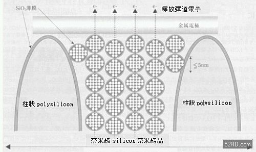 接著在玻璃基板上制作金屬電極,并將金屬電極上方的柱狀polysilicon膜層浸泡于氟酸與乙醇混合液內(nèi),同時施加電壓至混合液內(nèi)的白金負極,與polysilicon膜層的正極,進行類似電界研磨加工。由于silicon在某些條件下無法進行研磨,反而會產(chǎn)生silicon的奈米結(jié)晶,這種特殊現(xiàn)象主要是因為柱狀polysilicon的grainboundary的結(jié)合能量很低,使得該部份發(fā)生反應(yīng)析并出silicon,在此同時被析出的silicon會進行再結(jié)晶化,最后形成如圖1所示的奈米結(jié)構(gòu),這種被稱為自我組織的獨特現(xiàn)象發(fā)生與否,完全取決于制程條件的設(shè)定。