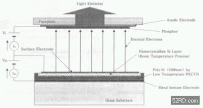 BSD釋放電子時是利用電子作熱激發(fā),使電子從基板下方注入NPS層,由于奈米結(jié)晶silicon的表面,是利用低溫氧化制程制成氧化薄膜,因此施加的電壓幾乎全部流入該氧化膜層內(nèi)進而形成強電界領(lǐng)域,而氧化膜的厚度非常的薄,所以電子很容易將強電界領(lǐng)域的氧化膜變成tunnel,并進入鄰接的奈米結(jié)晶silicon內(nèi),隨著電子通過氧化膜被加速,并朝向表面電極方向前進,如此反覆相同動作所以到達表面附近的電子,具備比熱平衡狀態(tài)更高的運動能量,而表面電極也變得很容易將成為tunnel的電子釋放至真空中。