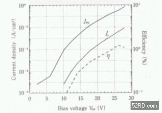 圖6是典型的BSD電子源的電壓?電流特性圖,圖中的橫軸為電壓,縱軸為電流密度,JPS是二極體(diode)的電流密度,JPS表示從二極體表面金屬膜層釋放至真空中的電子emission電流密度,一般emission電流祇能在VPS為正方向時才能觀測到。由圖可知隨著電壓增加,二極體的順向電流與釋放電流亦增大,當順向電壓為28V時emission電流密度約為8.9mA/cm²,emission效率約為1.2%左右。