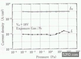 圖8是BSD電子源的周圍真空度發(fā)生變化時的emission電流變化特性,具體測試方法是將爐內(nèi)更換成氮素,接著抽真空至10-4Pa再逐漸導(dǎo)入氮素,藉此觀察真空度變化時的emission電流變化,圖中的橫軸為真空度,縱軸為二極體(diode)的電流密度,由圖可知即使真空度降至10-4,emission的電流密度幾乎無任何改變,顯示BSD電子源在真空度非常惡劣的環(huán)境下,仍具備良好的emission特性。