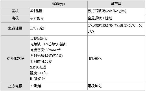 上述第1與第4項之流程系使用現(xiàn)有的成膜技術(shù)與材料;第2與第3項則為松下公司開發(fā)的多孔化PPS技術(shù)。有關(guān)第2項復(fù)晶硅膜制程必需將作業(yè)溫度與壓力等參數(shù)作最佳化組合,如此便可使蘇打石玻璃在450°C~550°C的低溫環(huán)境下完成長膜作業(yè)。第3項的電解液、液溫、電流密度等參數(shù)經(jīng)過作最佳化后,在一定條件下進行陽極氧化,之后必需再度更改制程參數(shù)(processparameter)才可再進行陽極氧化作業(yè)。