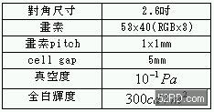 圖10表4分別是利率BSD技術(shù)制作之2.6吋彩色FED外觀圖與規(guī)格;由于BSD的電子發(fā)射源可在大cellgap環(huán)境下,以垂直方式在涂有螢光體的面板上產(chǎn)生圖樣(pattern),因此祇要驅(qū)動電路與驅(qū)動方式經(jīng)由最加化設(shè)計,便可獲得令人滿意的影像顯示效果。