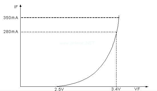 目前的新技術(shù)使LED能夠達到很高的功率水平,LED的功率能夠達到1W,甚至有些達到5W,光效達到60-85LM/W,這種LED設(shè)備稱為高亮LED(HB-LED)。目前我們用在照明上LED都是HB-LED,一般都是選擇1W的LED通過串并聯(lián)的方式組成大功率LED燈,尤其以串聯(lián)為主。這種LED的為3.4V±2%,正向電流為350mA左右。其-曲線如圖1.1所示。
