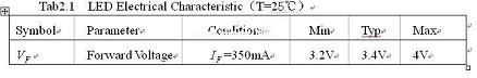 其次,恒功率控制都是預(yù)先假定輸出功率是恒定的,比如用9個1W(=3.4V, =350MA)的LED串聯(lián)起來用做一個9W的PAR燈,那么設(shè)計時候就會用=9W來計算。但實際上每個LED的都會偏差,偏差值如表2.1所示: