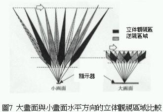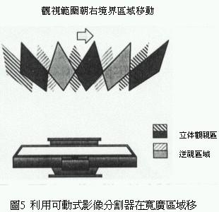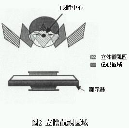 利用這種原理可以針對觀視者觀賞畫面時的最適當(dāng)位置,除了提供觀視者左右兩眼影像之外,由影像正面的顯示區(qū)到最適距離所函蓋的區(qū)域,對觀視者而言就變成正常的立體三次元影像。不過兩眼視線相鄰處的影像,會被左、右兩眼在無意識狀態(tài)下捕捉讀取形成所謂的逆視領(lǐng)域,換句話說使用這種三維立體影像分割器的觀視者必需固定在一定的觀視位置才能產(chǎn)生立體視覺效果(圖2)。