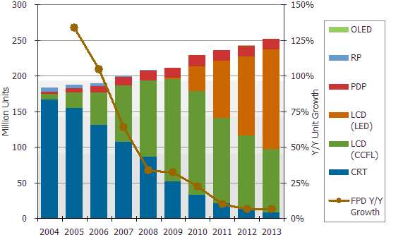 價(jià)格大幅下滑是促使2009年液晶電視高度成長(zhǎng)的主要因素,2009年液晶電視平均售價(jià)下滑24%,遠(yuǎn)遠(yuǎn)超過以往的記錄。不過按總量加權(quán)后,2010年液晶電視平均價(jià)格預(yù)計(jì)將僅下滑5%,而等離子電視則下滑10%;對(duì)于2010年平均價(jià)格較和緩下滑主要考慮,其一消費(fèi)者購(gòu)買大尺寸電視比率有機(jī)會(huì)增長(zhǎng),另一方面,使用采用LED背光液晶電視有較高價(jià)格。在等離子電視的部分,經(jīng)歷2009年成長(zhǎng)率下滑2%,藉由40寸以上產(chǎn)品增長(zhǎng)以及從更多廠商推出3D等離子電視,預(yù)計(jì)2010年等離子電視出貨量有機(jī)會(huì)成長(zhǎng)6%,超過1千500萬臺(tái)。 另一方面?zhèn)鹘y(tǒng)映像管電視市場(chǎng)持續(xù)萎縮,2009年下滑40%,預(yù)計(jì)2010年也將下滑36%。