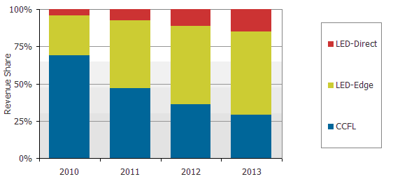 圖二 : 2010-2013 采CCFL與LED背光液晶電視按出貨金額計(jì)算市占率