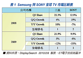 根據(jù)DisplaySearch研究指出,2009第三季全球電視品牌出貨金額排名與市佔(zhàn)率,三星皆為第一名,遠(yuǎn)勝暫居第三的SONY(見圖一),但是就三星現(xiàn)階段的作法來看,三星似乎不滿足,對於OLED TV與3DTV等產(chǎn)品線,三星集團(tuán)早已極積佈局。而就2010的CES展來看,三星推出65吋的3DTV,其中內(nèi)建3D處理器,可將2D內(nèi)容轉(zhuǎn)換成3D,同時(shí),三星也會推出藍(lán)光播放機(jī),同時(shí)支援3D內(nèi)容播放。