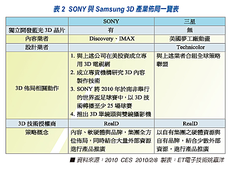 然而,消費(fèi)者要的不是一臺高科技電視,更要豐富的閱聽內(nèi)容。以3D影像產(chǎn)業(yè)而言,除了需要強(qiáng)大硬體裝置支援外,其豐富的3D內(nèi)容支援也是相當(dāng)重要的。09年的CES展,許多大廠開始拉攏平臺與內(nèi)容業(yè)者一同站臺,因?yàn)樗麄冎拦馐侵挥杏搀w不能讓消費(fèi)者買單,多元的加值服務(wù)才是消費(fèi)性電子未來的趨勢。2010年的CES展,同樣也是依循前年的模式,而且力道更加強(qiáng)勁,以補(bǔ)強(qiáng)各自提出自有的硬體解決方案。另一方面,以SONY與三星來說,兩家公司同時(shí)都與RealD技術(shù)合作以獲取3D的專利技術(shù),以避免專利侵權(quán)的問題發(fā)生,就以產(chǎn)業(yè)現(xiàn)況來看,頗有烘抬3D產(chǎn)業(yè)的味道(見表二)。