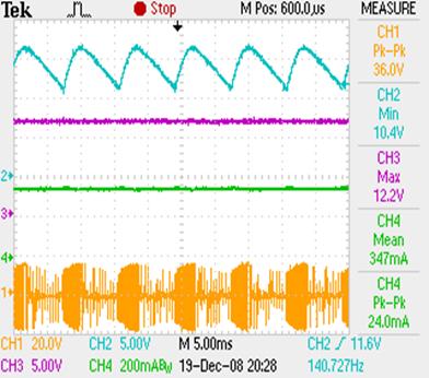 圖3:信道一為電子變壓器交流輸出電壓,信道二為經(jīng)過(guò)整流及濾波后的輸入電壓,信道三為交流輸入電壓,信道四為L(zhǎng)ED輸出電流。