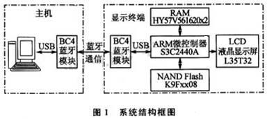 顯示終端由以ARM9微控制器S3C2440A為核心的嵌入式Linux平臺加上BlueCore4藍(lán)牙模塊以及LCD液晶顯示屏組成。Linux操作系統(tǒng)安裝在NANDFLASH中,并連接了64MB的外擴RAM。由于S3C2440A接口比較豐富,所以系統(tǒng)硬件具有較好的擴展性能。