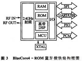 主機端和顯示終端都使用了CSR公司BlueCore4-ROM芯片組成的藍(lán)牙無線收發(fā)模塊。BlueCore4系列符合2.0版藍(lán)牙標(biāo)準(zhǔn),并與現(xiàn)有1.1版和1.2版藍(lán)牙設(shè)備完全兼容。這里采用的BlueCore4-ROM芯片具有很高的集成度,需要很少的外圍露件。它提供了UART、USB2.0等主機接口,并且提供了PCM音頻接口以及SPI接口。具有支持微微網(wǎng)和散射網(wǎng),低功耗,和手機良好兼容,可以和802.11協(xié)議共存等優(yōu)點。BlueCore4藍(lán)牙模塊結(jié)構(gòu)如圖3所示。