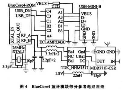 PC主機使用USB接口和BlueCore4藍(lán)牙模塊連接,對應(yīng)的藍(lán)牙模塊同樣通過USB接口和S3C2440A的USB-HOST接口進(jìn)行連接。USB接口具有即插即用的優(yōu)點。通過Linux操作系統(tǒng)的支持,該模塊還可以使用通用的USB藍(lán)牙適配器替代。BlueCore4藍(lán)牙模塊部分參考電路原理如圖4所示。