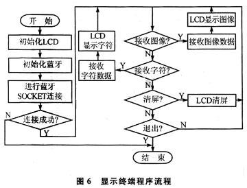 系統(tǒng)軟件同樣分為主機部分和顯示終端部分。這里主要分析顯示終端部分軟件的設(shè)計,主機部分與其類似。顯示終端部分程序包括:LCD液晶屏初始化,藍(lán)牙設(shè)備的初始化,藍(lán)牙連接的建立和圖像字符數(shù)據(jù)的傳輸顯示等幾個部分。程序流程如圖6所示。