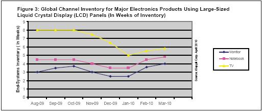 圖3所示為iSuppli公司對(duì)大尺寸LCD應(yīng)用的全球渠道庫存估測(cè)。iSuppli公司定義的大尺寸LCD面板是對(duì)角尺寸大于等于10英寸的面板。