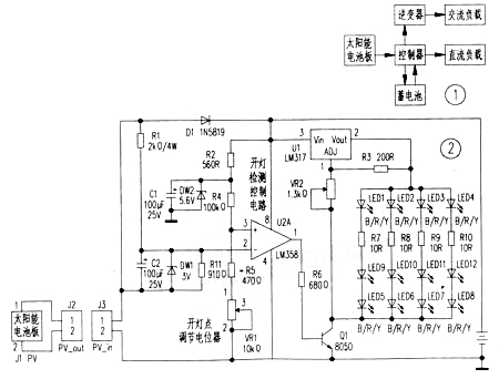 考慮到生產(chǎn)成本,電路中未設(shè)計(jì)蓄電池過(guò)充電控制電路。而蓄電池過(guò)放電控制原理則是充分利用了LED發(fā)光二極管的導(dǎo)通“勢(shì)壘”來(lái)實(shí)現(xiàn)的,雖未加蓄電池過(guò)放控制電路,同樣也能實(shí)現(xiàn)蓄電池的過(guò)放電保護(hù)功能。