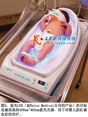 所幸,光療通常對此種病癥有效果,因為膽紅素會吸收藍(lán)光,分解為水溶形式而排出體外(圖2)。458nm~462nm區(qū)域中的窄帶藍(lán)光最有效。過去,膽紅素治療光線都采用定制的藍(lán)色熒光燈管和彩色過濾器。但是,熒光燈的光譜相對較寬。盡管其分布中心位于所需波長上,但光譜分布在兩端下降,表示能破壞膽紅素的光能量下降,因此治療時間將延長。與之相比,藍(lán)光LED膽紅素光源可以有正確的頻率,幾乎不浪費(fèi)光能量。另外,LED的膽紅素光源有機(jī)械穩(wěn)定特性,更長的壽命,也比熒光設(shè)備低廉。在未來,光線療法將能通過“發(fā)光服”提供光照,提供比光箱更有效的治療方法。