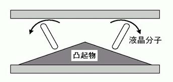 如圖,它依*叫做Protrusion的屋脊?fàn)钔蛊鹞飦?lái)使液晶本身產(chǎn)生一個(gè)預(yù)傾角(Pre-tiltAngle)。這個(gè)凸起物頂角的角度越大,則分子長(zhǎng)軸的傾斜度就越小。早期的VA模式液晶凸起物只在一側(cè),後期的MVA凸起物則在上下兩端。