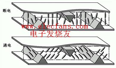 如圖是一種雙疇VA模式液晶。未加電時(shí),液晶分子長(zhǎng)軸垂直於螢?zāi)?,只有?近凸起物電極的液晶分子略有傾斜,光線此時(shí)無(wú)法穿過(guò)上下兩片偏光板。當(dāng)加電後,凸起物附近的液晶分子迅速帶動(dòng)其他液晶轉(zhuǎn)動(dòng)到垂直於凸起物表面狀態(tài),即分子長(zhǎng)軸傾斜於螢?zāi)唬干渎噬仙龔亩鴮?shí)現(xiàn)調(diào)制光線。在這種雙疇模式中相鄰的疇分子狀態(tài)正好對(duì)稱,長(zhǎng)軸指向不同的方向,VA模式就是利用這種不同的分子長(zhǎng)軸指向來(lái)實(shí)現(xiàn)光學(xué)補(bǔ)償。如圖,在B處看到的是中灰階,在A和C處能同時(shí)看到的高灰階和低灰階,混色後正好是中灰階。