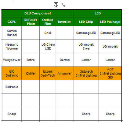 2. 目前正處于CCFL與LED背光產(chǎn)品世代交替之時(shí), 整機(jī)廠商應(yīng)積極主動(dòng)掌握LED背光資源,逐步取代CCFL,均衡健康的完成內(nèi)部供應(yīng)鏈結(jié)構(gòu)以及生產(chǎn)制造工序的調(diào)整。
