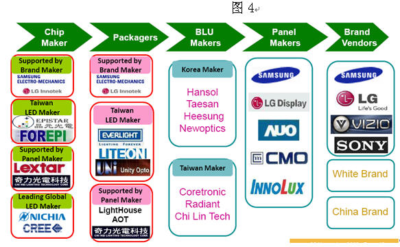 4. TV用背光源在LED市場(chǎng)中的份額將快速擴(kuò)大。