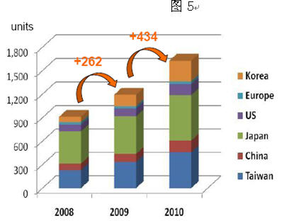 晶粒方面,預(yù)估全球MOCVD數(shù)量逐步增加(圖5),其中以韓國(guó)和臺(tái)灣廠商最為積極,Samsung, LG Innotek以及AUO旗下的Lextar都將增加MOCVD機(jī)臺(tái)數(shù)量至目前的2~3倍。到2010年底,預(yù)計(jì)全球高亮度LED晶粒月產(chǎn)能將接近200億,但目前市場(chǎng)應(yīng)用仍以移動(dòng)終端產(chǎn)品和汽車照明用為主,前兩者的應(yīng)用比重高達(dá)55%,但TV用背光源應(yīng)用比重總體仍將難突破20%,因此背光源缺貨狀況的緩解將需要較長(zhǎng)時(shí)間。