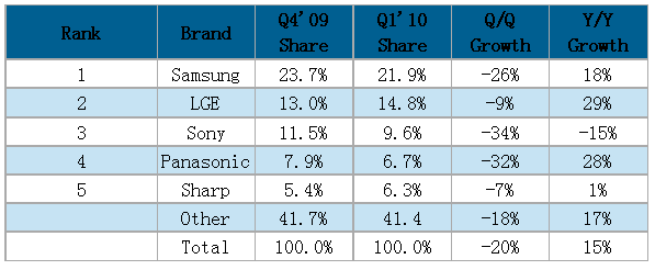 一季度三星電子(Samsung)出貨營收比率較去年第四季稍微下滑,不過利潤率相對較其它廠商好,出貨金額比率達(dá)21.9%。同時三星電子持續(xù)在新技術(shù)如LED與3D電視方面領(lǐng)先其它廠商,這也是該公司持續(xù)良好增長與較高產(chǎn)品價(jià)格主要原因。以應(yīng)用技術(shù)別來看,三星電子在LCD TV全球排名第一,在等離子電視則排名第二。