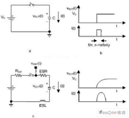 圖1︰從一個(gè)電壓源對(duì)電容進(jìn)行充電(圖a和b是理想情況,c和d是實(shí)際情況)。