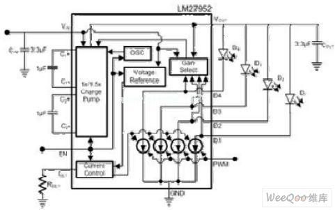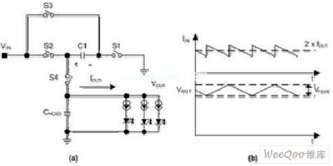 白光LED通常由一個(gè)恒定直流電流源驅(qū)動(dòng),以保持恒定的亮度。在采用單顆鋰離子電池供電的便攜式應(yīng)用中,白光LED以及電流源上的電壓降之總和可以比電池電壓更高或更低,這意味著白光LED某些時(shí)候需要對(duì)電池電壓進(jìn)行升壓。完成這樣應(yīng)用的最好辦法是使用升壓DC-DC轉(zhuǎn)換器。這種方法可以大大地優(yōu)化效率,但代價(jià)是成本和PCB面積增加。另外一種提升電池電壓的方法是使用電荷泵,也稱為開關(guān)電容轉(zhuǎn)換器。本文將詳細(xì)地分析這種器件的工作原理。