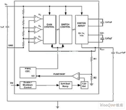 下調(diào)的輸出電壓通過PUMP/SKIP比較器與1.2V的電壓基準(zhǔn)比較。PUMP/SKIP比較器輸出電壓在啟動(dòng)時(shí)線性上升,提供軟啟動(dòng)功能。當(dāng)輸出電壓超過期望的極限,器件不會(huì)開啟,消耗的電源電流將很小。在這種空閑狀態(tài)的期間,輸出電容CHOLD提供輸出負(fù)載電流。隨著這個(gè)電容不斷放電以及輸出電壓降低到期望的輸出電壓以下,電荷泵被激活直到輸出電壓再次達(dá)到高于這個(gè)值。