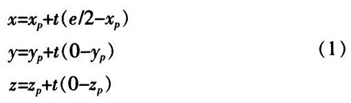 左視點Leye和右視點Reye均位于X軸上,兩視點間的距離為e,兩視點連線中心為坐標原點,則左視點的坐標為(-e/2,0,0),右視點的坐標為(+e/2,0,0)。投影平面平行于XY平面,到左右視點的距離均為d。三維空間中一點P(xp,yp,zp)在左視點投影中的坐標為(xl,yl,zl),在右視點投影中的坐標為(xr,yr,zr),則zl=zr=d。點P(xp,yp,zp)和Reye投影線的參數(shù)方程為: