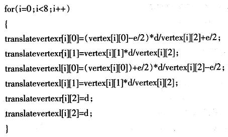按上述投影算法計算出立體圖像對后,應(yīng)用OpenGL繪制立體圖像對,分別用紅、綠兩種顏色繪制右眼和左眼的圖像。以一個變長為10cm,中心點在原點的正方體為例,設(shè)兩視點間距離e為5cm,投影面距高觀察者d為40cm,考察正方體的一個頂點(5,5,5),由上述投影算法可得:xr=32cm,xl=48cm,yl=yr=4040cm,zr=zl=d=40cm對8個頂點分別計算后,連接相應(yīng)的立體透視投影點,即可得該立方體的立體圖像對。用數(shù)組vertex[8][3]存儲頂點,數(shù)組translatevertexr[8][3]存儲右眼投影計算后坐標,數(shù)組translatevertexl[8][3]存儲左眼投影計算后的坐標,對相應(yīng)的點進行投影計算: