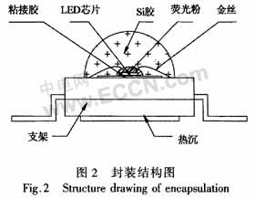 Si襯底的功率型GaN基LED封裝采用仿流明的支架封裝形式,其外形有朗柏型、矩形和雙翼型。其制作過程為:使用導(dǎo)熱系數(shù)較高的194合金金屬支架,先將LED芯片粘接在金屬支架的反光杯底部,再通過鍵合工藝將金屬引線連接LED芯片與金屬支架電極,完成電氣連接,最后用有機封裝材料(如Si膠)覆蓋芯片和電極引線,形成封裝保護和光學(xué)通道。這種封裝對于取光效率、散熱性能、加大工作電流密度的設(shè)計都是最佳的。其主要特點包括:熱阻低(小于10℃/W),可靠性高,封裝內(nèi)部填充穩(wěn)定的柔性膠凝體,在-40~120℃范圍,不會因溫度驟變產(chǎn)生的內(nèi)應(yīng)力,使金絲與支架斷開,并防止有機封裝材料變黃,引線框架也不會因氧化而沾污;優(yōu)化的封裝結(jié)構(gòu)設(shè)計使光學(xué)效率、外量子效率性能優(yōu)異,其結(jié)構(gòu)見圖2。