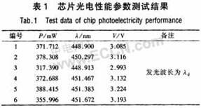 通過優(yōu)化Si襯底表面的處理和緩沖層結(jié)構(gòu),成功生長出可用于大功率芯片的外延材料。采用Pt電極作為反射鏡,成功實現(xiàn)大功率芯片的薄膜轉(zhuǎn)移。采用銀作為反射鏡,大大提高了反射效率,通過改進(jìn)反射鏡的設(shè)計并引入粗化技術(shù),提高了光輸出功率。改進(jìn)了Ag反射鏡蒸鍍前p型GaN表面的清洗工藝和晶片焊接工藝,改善了銀反射鏡的歐姆接觸,量子阱前引入緩沖結(jié)構(gòu),提高了芯片發(fā)光效率,優(yōu)化量子阱/壘界面生長工藝,發(fā)光效率進(jìn)一步提高,通過改進(jìn)焊接技術(shù),減少了襯底轉(zhuǎn)移過程中芯片裂紋問題,芯片制備的良率大幅度提高,且可靠性獲得改善。通過上述多項技術(shù)的應(yīng)用和改進(jìn),成功制備出尺寸1mm×1mm,350mA下光輸出功率大于380mW的藍(lán)色發(fā)光芯片,發(fā)光波長451nm,工作電壓3.2V,完成課題規(guī)定的指標(biāo)。表1為芯片光電性能參數(shù)測試結(jié)果。